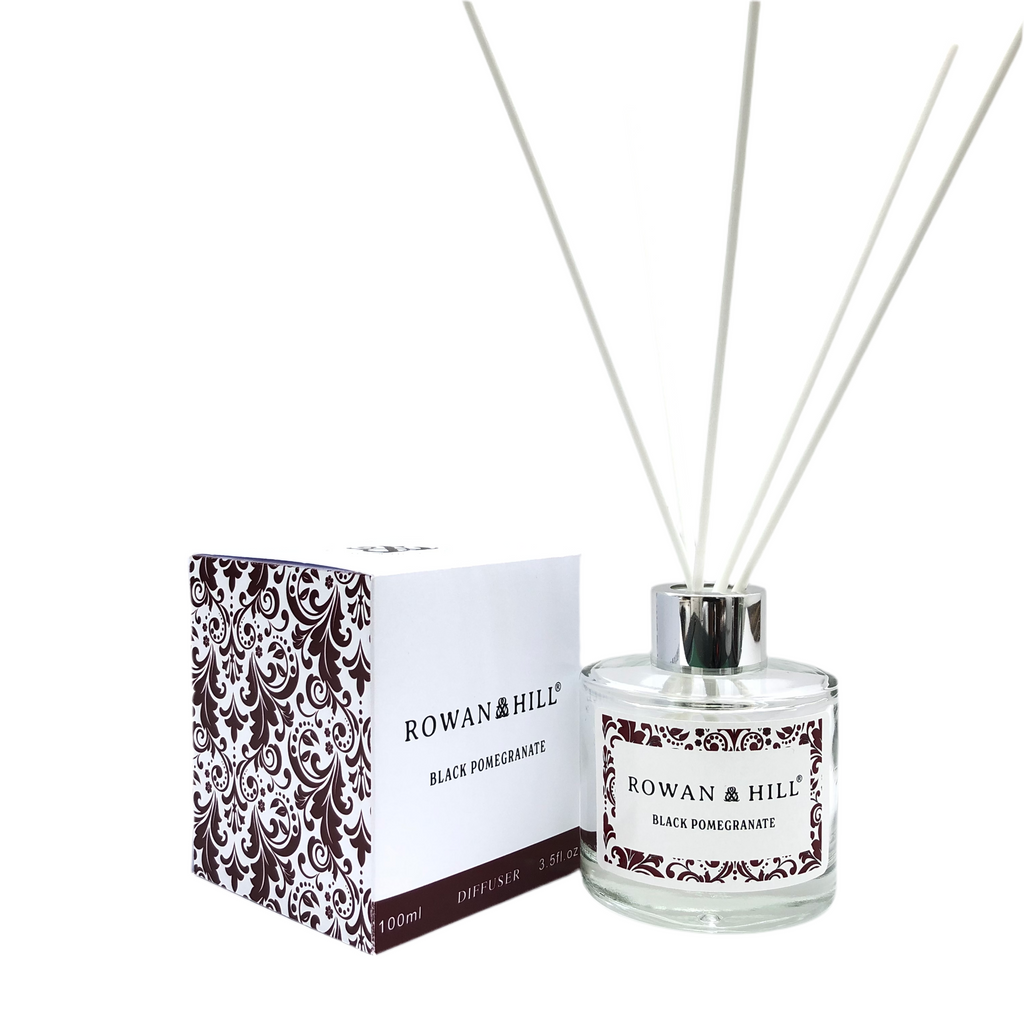 Un recipiente de vidrio de 100 ml, lleno de nuestras mejores fragancias y una base difusora ecológica de bajo olor.